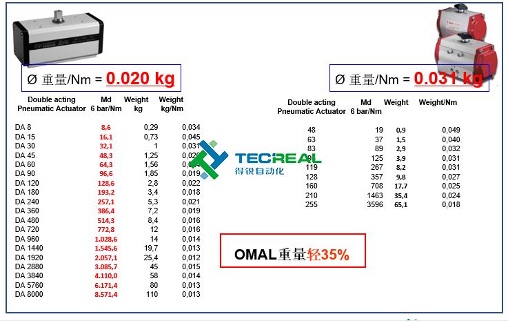 同樣我們先看雙動型,OMAL的? 重量/Nm = 0.020 kg,而Bray? 重量/Nm = 0.031 kg,從上面的結(jié)果可以看出,OMAL撥叉式氣動執(zhí)行器重量比對方輕35%。重量輕,則代表體積也小,那么在客戶安裝和維修的時候也會更加方便。