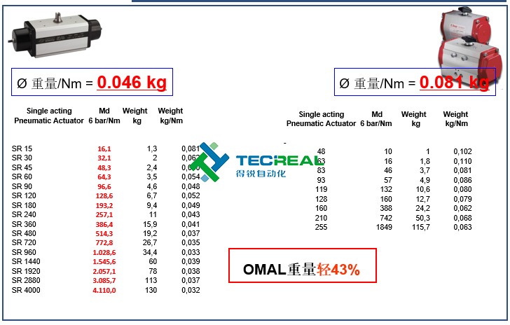 我們再看看雙方的單動型氣動執(zhí)行器在重量上的表現(xiàn),從圖中可以看到,OMAL的? 重量/Nm = 0.046 kg,Bray? 重量/Nm = 0.081 kg,OMAL的重量則要比對方輕43%。