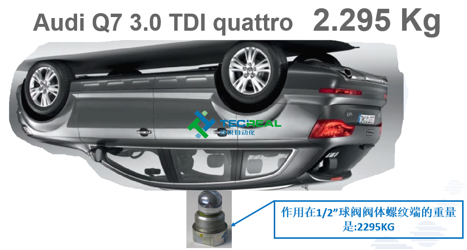 而閥體螺紋端可承受重量為2295kg,相當(dāng)于可承受一輛奧迪Q7 3.0 TDI汽車(chē)。并且OMAL高壓球閥通過(guò)了1000bar的外殼測(cè)試。