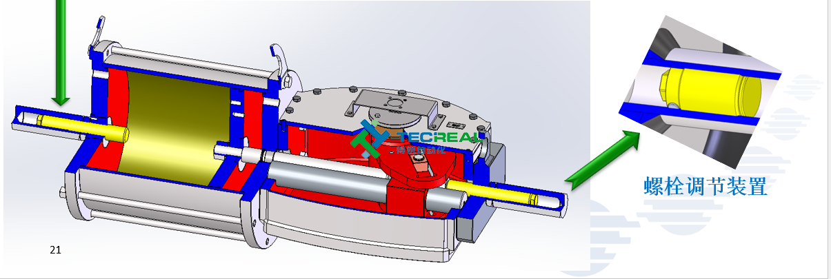 8.總的運(yùn)行角度 100 ° (-5 ° +95 °),調(diào)節(jié)螺栓可在執(zhí)行器打開或關(guān)閉的位置上進(jìn)行± 5 °的調(diào)節(jié),而且不管是雙作用還是單作用,調(diào)節(jié)螺栓都有保護(hù)帽,確保功能的完整性。