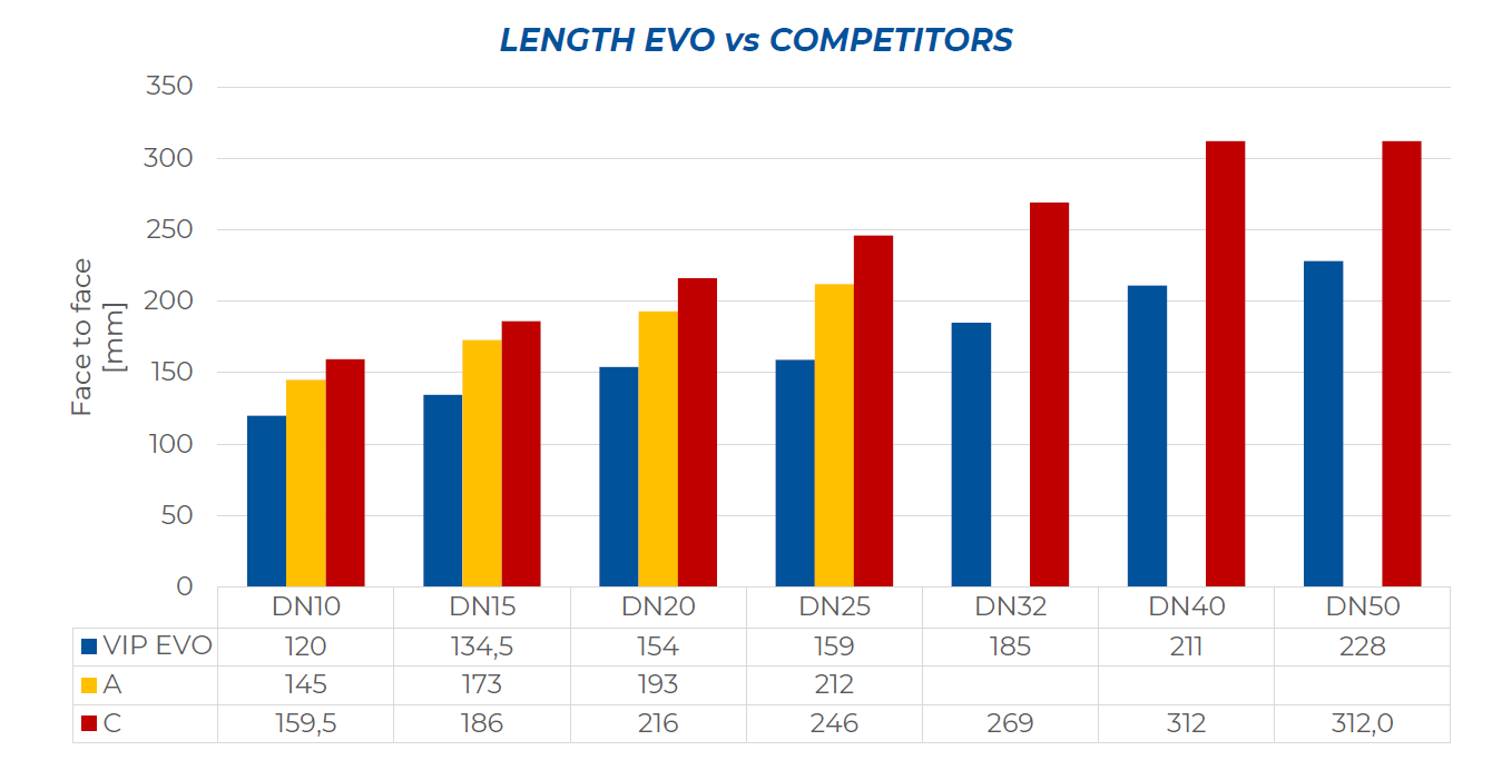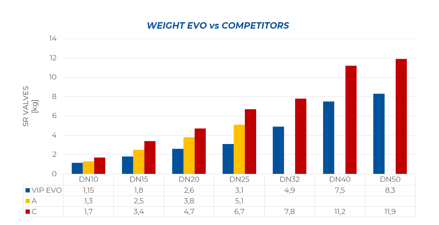 在下圖中與競爭對手產品的對比中,VIP EVO閥門在體積和重量上都是完勝對手。