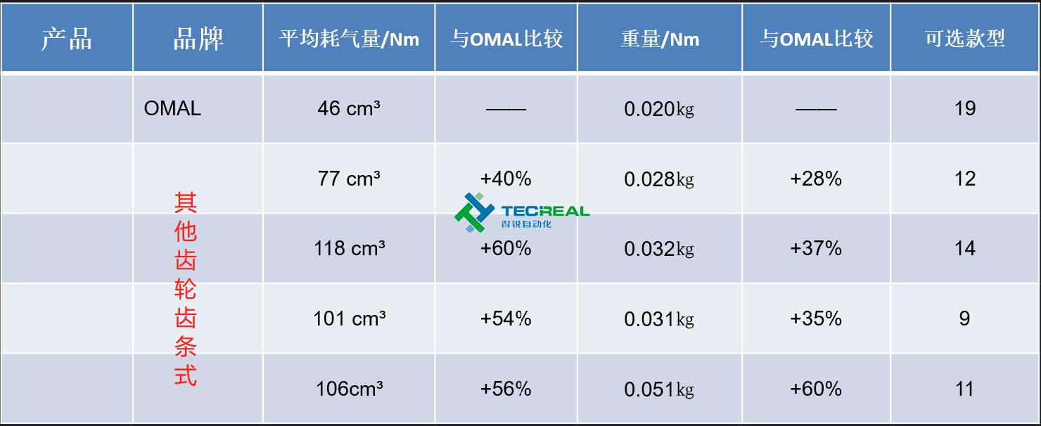 我們再多選取幾款市面上常見的齒輪齒條式氣動執(zhí)行器,在耗氣量和重量上與OMAL的撥叉式結(jié)構(gòu)對比。從下圖的對比結(jié)果可以看到,齒輪齒條式結(jié)構(gòu)的執(zhí)行器無論是在耗氣量和重量上大于撥叉式結(jié)構(gòu)。