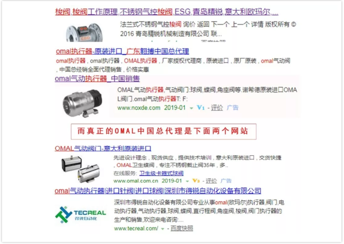 "樹大招風(fēng)”,自然會引起諸多企業(yè)的模仿,OMAL作為國際知名品牌,肯定會有不少人去某搜索引擎去查詢。然而我們發(fā)現(xiàn),有不少企業(yè)打著意大利OMAL的招牌,或者利用意大利OMAL做搜索關(guān)鍵詞。這些山寨閥門實(shí)在太過無法無天。