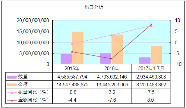 在2015-2016年度,我國閥門出口總量從45.85億套/千克增長到47.33億套/千克,增長了3.2%;2017年1-7月,我們閥門出口總量為29.34億套/千克,比上年同期增長7.5%。