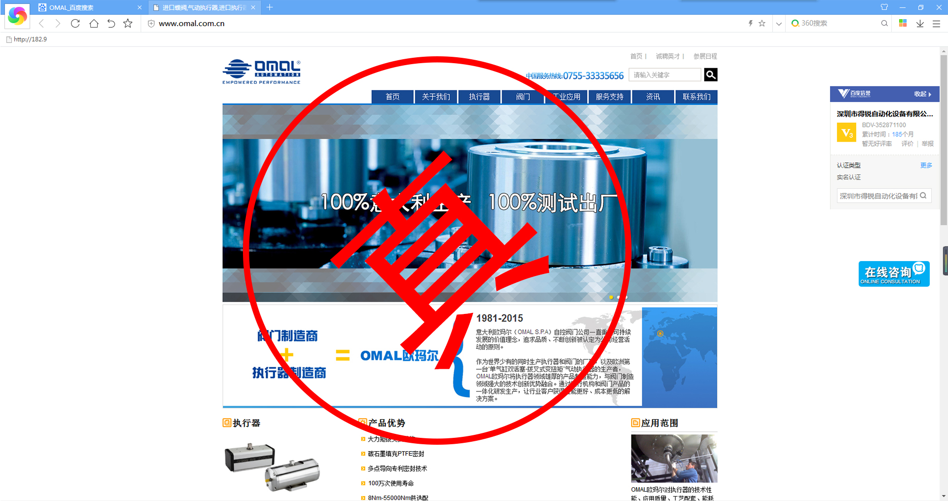 比如我們意大利OMAL的官網(wǎng)域名是www.omal.it,而有一家名叫上海相澤的公司,域名就是www.omal-sh.com。這讓我們意大利OMAL很是困惑,因為OMAL自控閥門在中國國內(nèi),并沒有這么一家叫上海相澤的經(jīng)銷商,同樣的還有一家叫上海樊信的公司,域名是www.omal-valve.com,網(wǎng)站首頁就是我們意大利OMAL的企業(yè)logo,這難道不是赤裸裸的假冒?還有諸如名為威斯特工業(yè)設(shè)備有限公司、湖北卓鎂工控設(shè)備有限公司等公司,把OMAL產(chǎn)品廣告在百度上打的不亦樂乎。